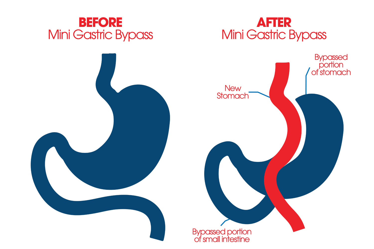 Ces deux interventions consistent à créer une petite poche dans la partie proximale de l’estomac, et un court-circuit en raccordant cette poche directement à la partie moyenne de l’intestin. Une malabsorption est ainsi provoquée.